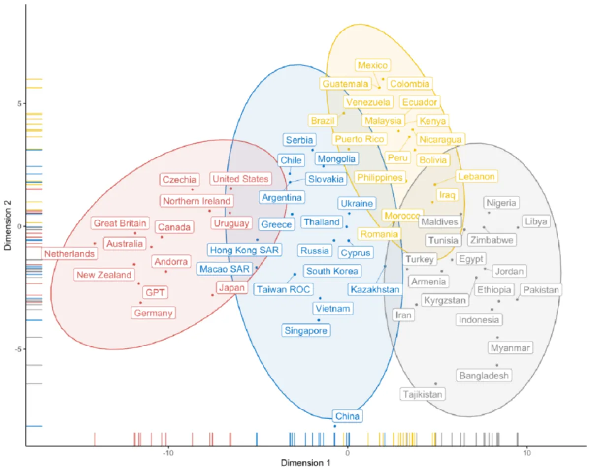 The result was a global map in which countries cluster according to shared values. Western democracies tend to group together, while other regions (including parts of Asia, Latin America and the Middle East) form distinct clusters.