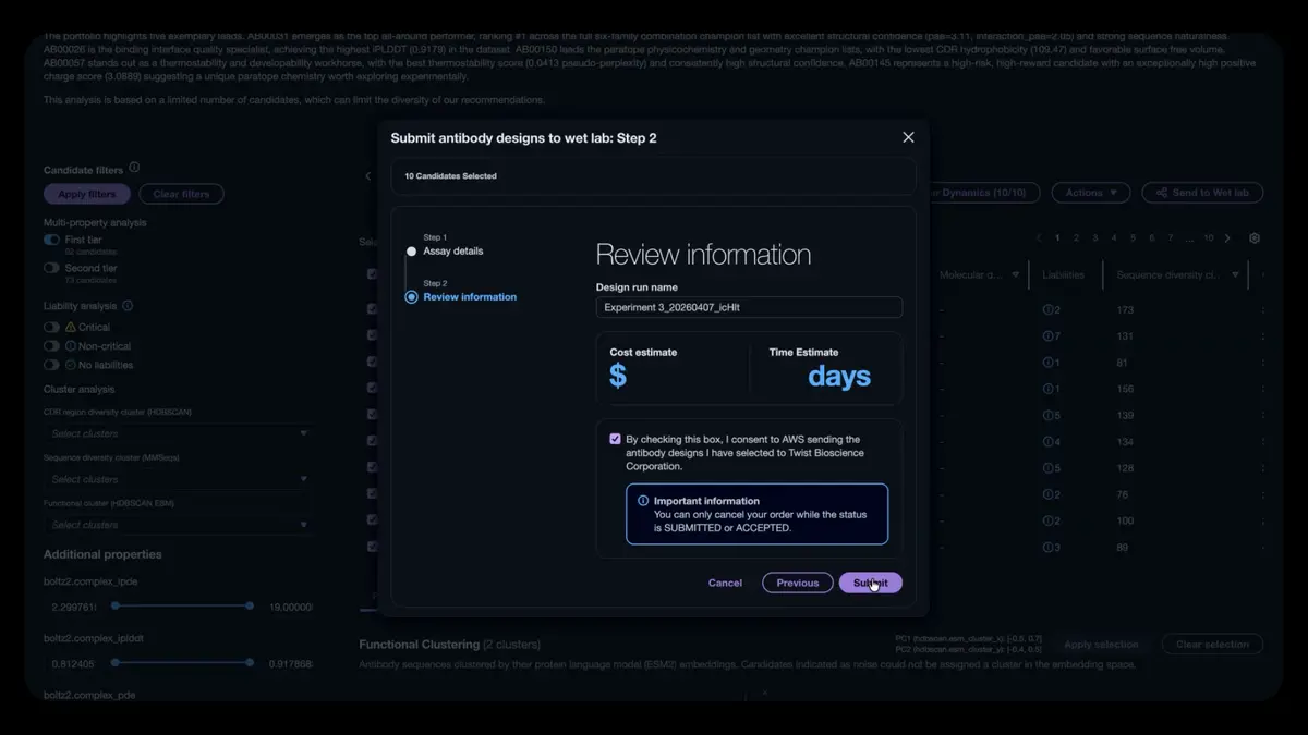 Once testing is complete, the data is routed back into the software through what AWS calls an experimental data registry. This lets scientists track inputs and outcomes in one place and use the latest wet-lab results to fine-tune models.