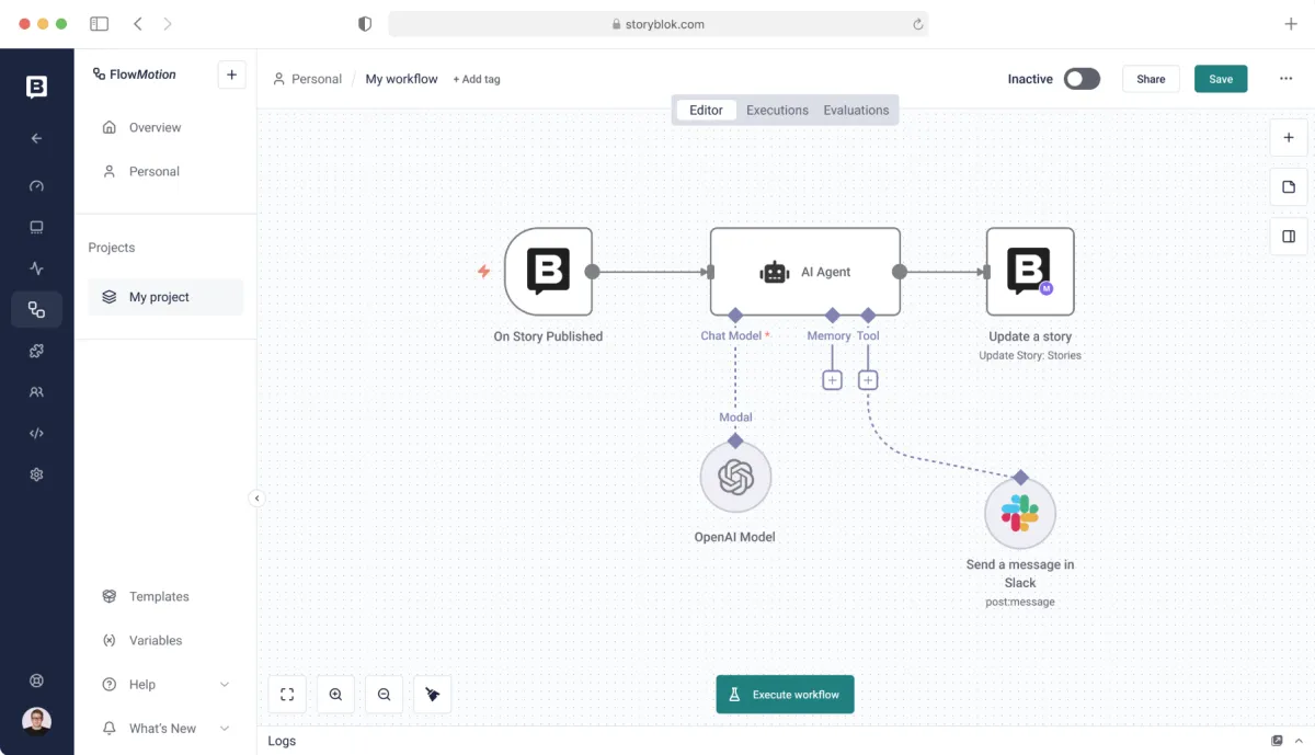 FlowMotion allows content events in Storyblok, including create, update, approve, translate, schedule and publish actions, to trigger workflows. Those workflows can sequence tasks, pause for human approval, apply governance rules and run only in selected cases.